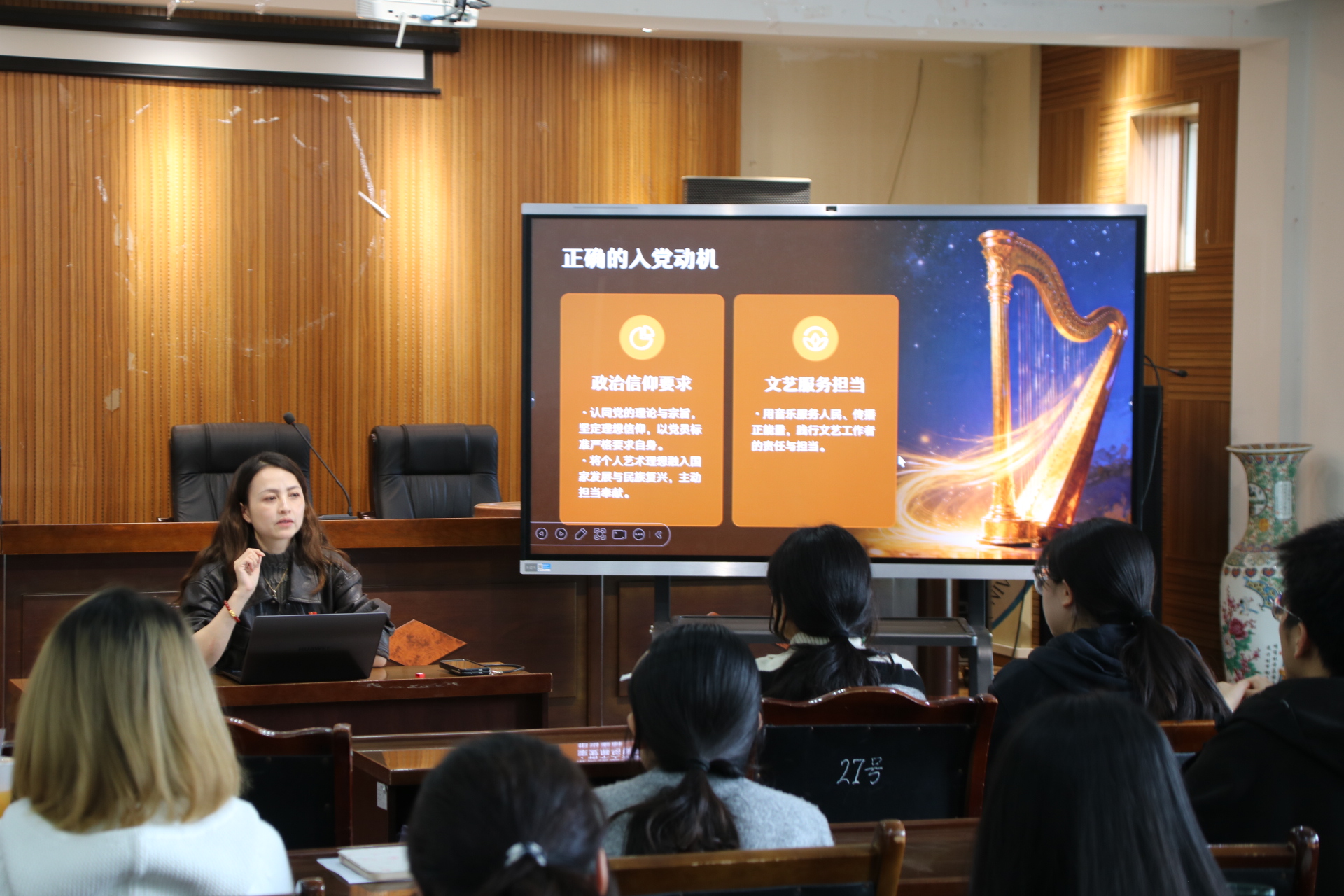 端正入党动机是廉洁自律的起点。谢琳指出,认同党的理论与宗旨、坚定理想信念,是将个人艺术理想融入国家发展与民族复兴的前提。她勉励同学们以音乐服务人民、传播正能量,自觉践行文艺担当,主动以党员标准严格要求自己。围绕入党积极分子的日常培养,谢琳强调了严守学习纪律、真诚汇报思想、杜绝形式主义、发挥带头作用、接受师生监督、坚持德艺兼修、知行合一等具体要求,并着重阐释了新时代大学生对“尚俭戒奢”价值追求的应有自觉——廉洁不仅是底线操守,更是一种生活方式的理性选择,应当从点滴学习、生活、交往中涵养清正简约的品格。
